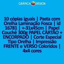 E-mail LUIZ@GRAFICA.DESIGN10 cópias iguais | Pasta com Orelha Laminação Fosca | id 16781 | +-31x45cm | Papel Couchê 300g PAPEL CARTÃO + ENCORPADO | Corte Especial Tipo Orelha | Impressão FRENTE e VERSO Coloridos | 4x4 cores