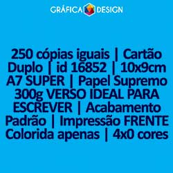 250 cópias iguais | Cartão Duplo | id 16852 | 10x9cm A7 SUPER | Papel Supremo 300g VERSO IDEAL PARA ESCREVER | Impressão FRENTE Colorida apenas | 4x0 cores