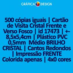 500 cópias iguais | Cartão de Visita Cristal Frente e Verso Fosco | id 17473 | +-8,5x5,4cm | Plástico PVC 0,5mm Médio BRILHO CRISTAL | Cantos Redondos | Impressão FRENTE Colorida apenas | 4x0 cores