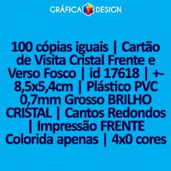 100 cópias iguais | Cartão de Visita Cristal Frente e Verso Fosco | id 17618 | +-8,5x5,4cm | Plástico PVC 0,7mm Grosso BRILHO CRISTAL | Cantos Redondos | Impressão FRENTE Colorida apenas | 4x0 cores