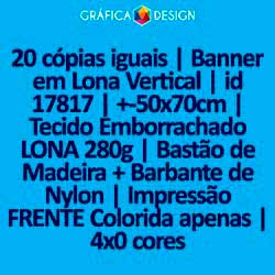 20 cópias iguais | Banner em Lona Vertical | id 17817 | +-50x70cm | Tecido Emborrachado LONA 280g | Bastão de Madeira + Barbante de Nylon | Impressão FRENTE Colorida apenas | 4x0 cores