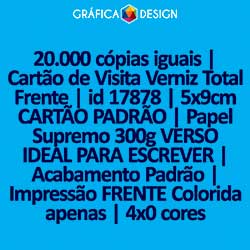 20.000 cópias iguais | Cartão de Visita Verniz Total Frente | id 17878 | 5x9cm CARTÃO PADRÃO | Papel Supremo 300g VERSO IDEAL PARA ESCREVER | Impressão FRENTE Colorida apenas | 4x0 cores