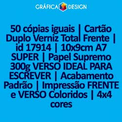 50 cópias iguais | Cartão Duplo Verniz Total Frente | id 17914 | 10x9cm A7 SUPER | Papel Supremo 300g VERSO IDEAL PARA ESCREVER | Impressão FRENTE e VERSO Coloridos | 4x4 cores