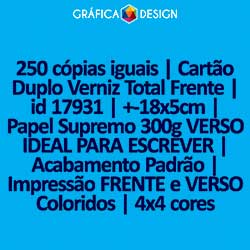 250 cópias iguais | Cartão Duplo Verniz Total Frente | id 17931 | +-18x5cm | Papel Supremo 300g VERSO IDEAL PARA ESCREVER | Impressão FRENTE e VERSO Coloridos | 4x4 cores