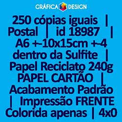 250 cópias iguais | Postal | id 18987 | 10x15cm A6 +-4 dentro da Sulfite | Papel Reciclato 240g PAPEL CARTÃO | Impressão FRENTE Colorida apenas | 4x0 cores