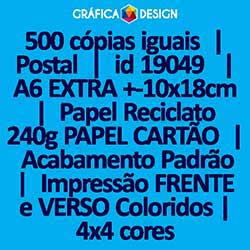 500 cópias iguais | Postal | id 19049 | 18x10cm A6 EXTRA | DL Reduzido | Papel Reciclato 240g PAPEL CARTÃO | Impressão FRENTE e VERSO Coloridos | 4x4 cores