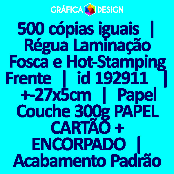 E-mail LUIZ@GRAFICA.DESIGN500 cópias iguais | Régua Laminação Fosca e Hot-Stamping Frente | id 192911 | +-27x5cm | Papel Couchê 300g PAPEL CARTÃO + ENCORPADO | Impressão FRENTE e VERSO Coloridos | 4x4 cores