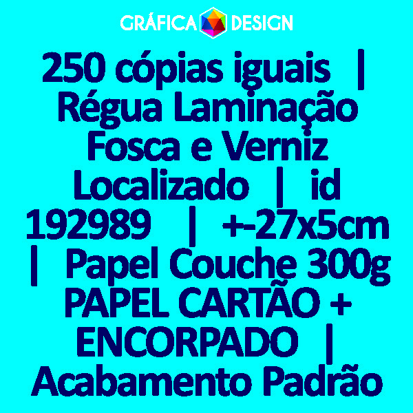 E-mail LUIZ@GRAFICA.DESIGN250 cópias iguais | Régua Laminação Fosca e Verniz Localizado | id 192989 | +-27x5cm | Papel Couchê 300g PAPEL CARTÃO + ENCORPADO | Impressão FRENTE e VERSO Coloridos | 4x4 cores