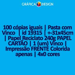 100 cópias iguais | Pasta com Vinco | id 19315 | +-31x45cm | Papel Reciclato 240g PAPEL CARTÃO | 1 (um) Vinco | Impressão FRENTE Colorida apenas | 4x0 cores
