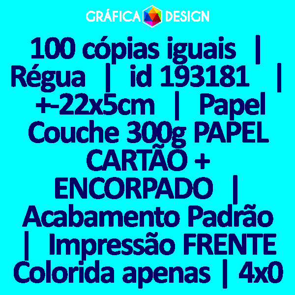 E-mail LUIZ@GRAFICA.DESIGN100 cópias iguais | Régua | id 193181 | +-22x5cm | Papel Couchê 300g PAPEL CARTÃO + ENCORPADO | Impressão FRENTE Colorida apenas | 4x0 cores