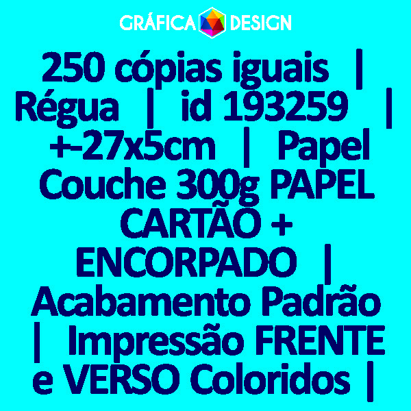 E-mail LUIZ@GRAFICA.DESIGN250 cópias iguais | Régua | id 193259 | +-27x5cm | Papel Couchê 300g PAPEL CARTÃO + ENCORPADO | Impressão FRENTE e VERSO Coloridos | 4x4 cores