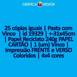 25 cópias iguais | Pasta com Vinco | id 19329 | +-31x45cm | Papel Reciclato 240g PAPEL CARTÃO | 1 (um) Vinco | Impressão FRENTE e VERSO Coloridos | 4x4 cores