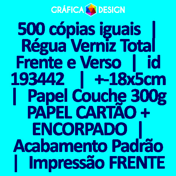 E-mail LUIZ@GRAFICA.DESIGN500 cópias iguais | Régua Verniz Total Frente e Verso | id 193442 | +-18x5cm | Papel Couchê 300g PAPEL CARTÃO + ENCORPADO | Impressão FRENTE e VERSO Coloridos | 4x4 cores