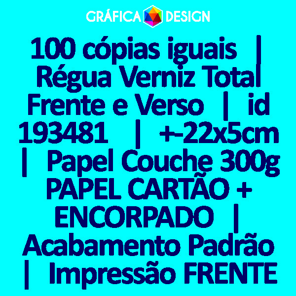 E-mail LUIZ@GRAFICA.DESIGN100 cópias iguais | Régua Verniz Total Frente e Verso | id 193481 | +-22x5cm | Papel Couchê 300g PAPEL CARTÃO + ENCORPADO | Impressão FRENTE e VERSO Coloridos | 4x4 cores