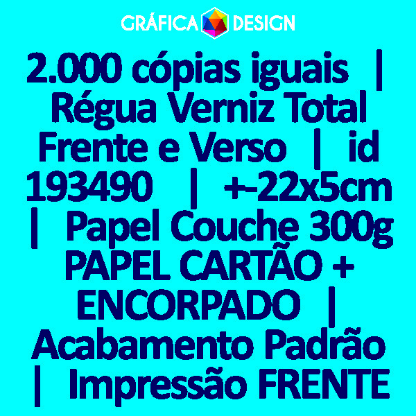 E-mail LUIZ@GRAFICA.DESIGN2.000 cópias iguais | Régua Verniz Total Frente e Verso | id 193490 | +-22x5cm | Papel Couchê 300g PAPEL CARTÃO + ENCORPADO | Impressão FRENTE e VERSO Coloridos | 4x4 cores