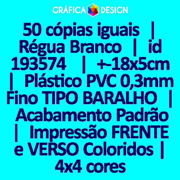 50 cópias iguais | Régua Branco | id 193574 | +-18x5cm | Plástico PVC 0,3mm Fino TIPO BARALHO | Impressão FRENTE e VERSO Coloridos | 4x4 cores