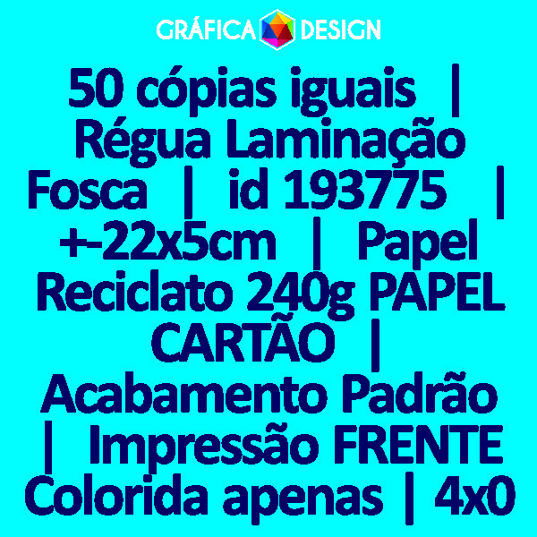 50 cópias iguais | Régua Laminação Fosca | id 193775 | +-22x5cm | Papel Reciclato 240g PAPEL CARTÃO | Impressão FRENTE Colorida apenas | 4x0 cores