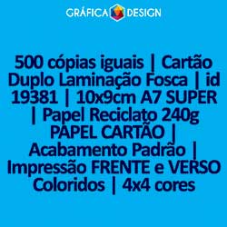 500 cópias iguais | Cartão Duplo Laminação Fosca | id 19381 | 10x9cm A7 SUPER | Papel Reciclato 240g PAPEL CARTÃO | Impressão FRENTE e VERSO Coloridos | 4x4 cores