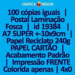 100 cópias iguais | Postal Laminação Fosca | id 19384 | 10x9cm A7 SUPER | Papel Reciclato 240g PAPEL CARTÃO | Impressão FRENTE Colorida apenas | 4x0 cores