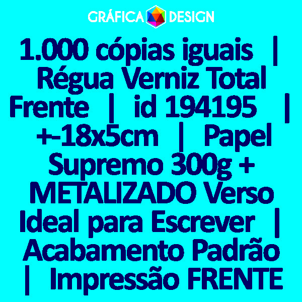 E-mail LUIZ@GRAFICA.DESIGN1.000 cópias iguais | Régua Verniz Total Frente | id 194195 | +-18x5cm | Papel Supremo 300g + METALIZADO Verso Ideal para Escrever | Impressão FRENTE e VERSO Coloridos | 4x4 cores