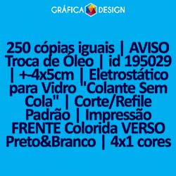 E-mail LUIZ@GRAFICA.DESIGN250 cópias iguais | AVISO Troca de Óleo | id 195029 | +-4x5cm | Eletrostático para Vidro "Colante Sem Cola" | Impressão FRENTE Colorida VERSO Preto&Branco | 4x1 cores