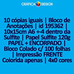 10 cópias iguais | Bloco de Anotações | id 195362 | 10x15cm A6 +-4 dentro da Sulfite | Papel Sulfite 120g PAPEL + ENCORPADO | Bloco Colado c/ 100 folhas | Impressão FRENTE Colorida apenas | 4x0 cores
