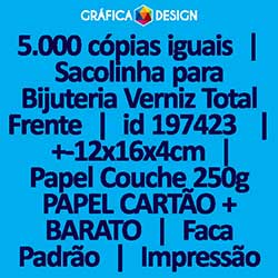 5.000 cópias iguais | Sacolinha para Bijuteria Verniz Total Frente | id 197423 | +-12x16x4cm | Papel Couchê 250g PAPEL CARTÃO + BARATO | Faca Corte Padrão | Impressão FRENTE Colorida apenas | 4x0 cores
