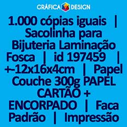 1.000 cópias iguais | Sacolinha para Bijuteria Laminação Fosca | id 197459 | +-12x16x4cm | Papel Couchê 300g PAPEL CARTÃO + ENCORPADO | Faca Corte Padrão | Impressão FRENTE Colorida apenas | 4x0 cores
