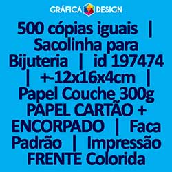 500 cópias iguais | Sacolinha para Bijuteria | id 197474 | +-12x16x4cm | Papel Couchê 300g PAPEL CARTÃO + ENCORPADO | Faca Corte Padrão | Impressão FRENTE Colorida apenas | 4x0 cores
