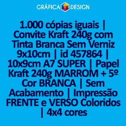 E-mail LUIZ@GRAFICA.DESIGN1.000 cópias iguais | Convite Kraft 240g com Tinta Branca 9x10cm | id 457864 | 10x9cm A7 SUPER | Papel Kraft 240g MARROM + 5º Cor BRANCA | Impressão FRENTE e VERSO Coloridos | 4x4 cores
