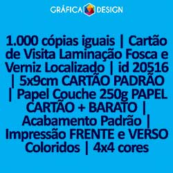 1.000 cópias iguais | Cartão de Visita Laminação Fosca e Verniz Localizado | id 20516 | 5x9cm CARTÃO PADRÃO | Papel Couchê 250g PAPEL CARTÃO + BARATO | Impressão FRENTE e VERSO Coloridos | 4x4 cores
