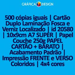 500 cópias iguais | Cartão Duplo Laminação Fosca e Verniz Localizado | id 20580 | 10x9cm A7 SUPER | Papel Couchê 250g PAPEL CARTÃO + BARATO | Impressão FRENTE e VERSO Coloridos | 4x4 cores