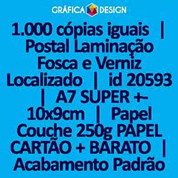 1.000 cópias iguais | Postal Laminação Fosca e Verniz Localizado | id 20593 | 10x9cm A7 SUPER | Papel Couchê 250g PAPEL CARTÃO + BARATO | Impressão FRENTE Colorida apenas | 4x0 cores