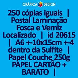 250 cópias iguais | Postal Laminação Fosca e Verniz Localizado | id 20615 | 10x15cm A6 +-4 dentro da Sulfite | Papel Couchê 250g PAPEL CARTÃO + BARATO | Impressão FRENTE e VERSO Coloridos | 4x4 cores