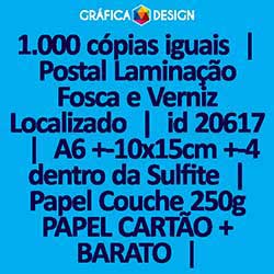 1.000 cópias iguais | Postal Laminação Fosca e Verniz Localizado | id 20617 | 10x15cm A6 +-4 dentro da Sulfite | Papel Couchê 250g PAPEL CARTÃO + BARATO | Impressão FRENTE e VERSO Coloridos | 4x4 cores