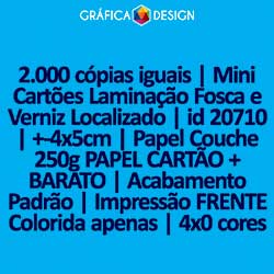 2.000 cópias iguais | Mini Cartões Laminação Fosca e Verniz Localizado | id 20710 | +-4x5cm | Papel Couchê 250g PAPEL CARTÃO + BARATO | Impressão FRENTE Colorida apenas | 4x0 cores