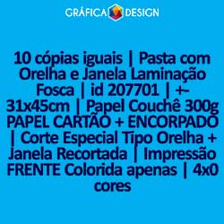 10 cópias iguais | Pasta com Orelha e Janela Laminação Fosca | id 207701 | +-31x45cm | Papel Couchê 300g PAPEL CARTÃO + ENCORPADO | Corte Especial Tipo Orelha + Janela Recortada | Impressão FRENTE Colorida apenas | 4x0 cores