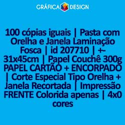 100 cópias iguais | Pasta com Orelha e Janela Laminação Fosca | id 207710 | +-31x45cm | Papel Couchê 300g PAPEL CARTÃO + ENCORPADO | Corte Especial Tipo Orelha + Janela Recortada | Impressão FRENTE Colorida apenas | 4x0 cores