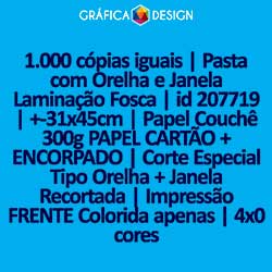 1.000 cópias iguais | Pasta com Orelha e Janela Laminação Fosca | id 207719 | +-31x45cm | Papel Couchê 300g PAPEL CARTÃO + ENCORPADO | Corte Especial Tipo Orelha + Janela Recortada | Impressão FRENTE Colorida apenas | 4x0 cores
