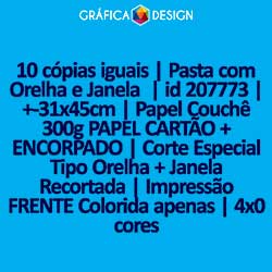 10 cópias iguais | Pasta com Orelha e Janela | id 207773 | +-31x45cm | Papel Couchê 300g PAPEL CARTÃO + ENCORPADO | Corte Especial Tipo Orelha + Janela Recortada | Impressão FRENTE Colorida apenas | 4x0 cores