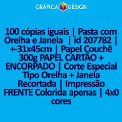 100 cópias iguais | Pasta com Orelha e Janela | id 207782 | +-31x45cm | Papel Couchê 300g PAPEL CARTÃO + ENCORPADO | Corte Especial Tipo Orelha + Janela Recortada | Impressão FRENTE Colorida apenas | 4x0 cores