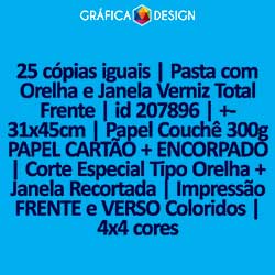 25 cópias iguais | Pasta com Orelha e Janela Verniz Total Frente | id 207896 | +-31x45cm | Papel Couchê 300g PAPEL CARTÃO + ENCORPADO | Corte Especial Tipo Orelha + Janela Recortada | Impressão FRENTE e VERSO Coloridos | 4x4 cores