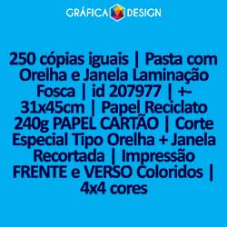 250 cópias iguais | Pasta com Orelha e Janela Laminação Fosca | id 207977 | +-31x45cm | Papel Reciclato 240g PAPEL CARTÃO | Corte Especial Tipo Orelha + Janela Recortada | Impressão FRENTE e VERSO Coloridos | 4x4 cores