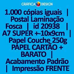 1.000 cópias iguais | Postal Laminação Fosca | id 20938 | 10x9cm A7 SUPER | Papel Couchê 250g PAPEL CARTÃO + BARATO | Impressão FRENTE Colorida apenas | 4x0 cores