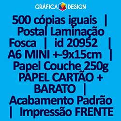 500 cópias iguais | Postal Laminação Fosca | id 20952 | 15x9cm A6 MINI +-4 dentro da Sulfite | Papel Couchê 250g PAPEL CARTÃO + BARATO | Impressão FRENTE e VERSO Coloridos | 4x4 cores