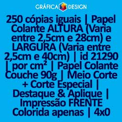 E-mail LUIZ@GRAFICA.DESIGN250 cópias iguais | Papel Colante ALTURA (Varia entre 2,5cm e 28cm) e LARGURA (Varia entre 2,5cm e 40cm) | id 21290 | por cm² | Papel Colante Couchê 90g | Meio Corte + Corte Especial | Destaque & Aplique | Impressão FRENTE Colorida apenas | 4x0 cores