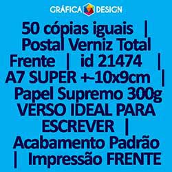 50 cópias iguais | Postal Verniz Total Frente | id 21474 | 10x9cm A7 SUPER | Papel Supremo 300g VERSO IDEAL PARA ESCREVER | Impressão FRENTE e VERSO Coloridos | 4x4 cores