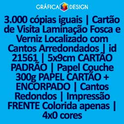 3.000 cópias iguais | Cartão de Visita Laminação Fosca e Verniz Localizado com Cantos Arredondados | id 21561 | 5x9cm CARTÃO PADRÃO | Papel Couchê 300g PAPEL CARTÃO + ENCORPADO | Cantos Redondos | Impressão FRENTE Colorida apenas | 4x0 cores