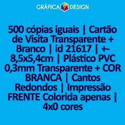500 cópias iguais | Cartão de Visita Transparente + Branco | id 21617 | +-8,5x5,4cm | Plástico PVC 0,3mm Transparente + COR BRANCA | Cantos Redondos | Impressão FRENTE Colorida apenas | 4x0 cores