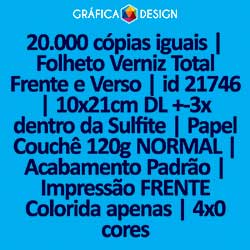 20.000 cópias iguais | Folheto Verniz Total Frente e Verso | id 21746 | 10x21cm DL +-3x dentro da Sulfite | Papel Couchê 120g NORMAL | Impressão FRENTE Colorida apenas | 4x0 cores